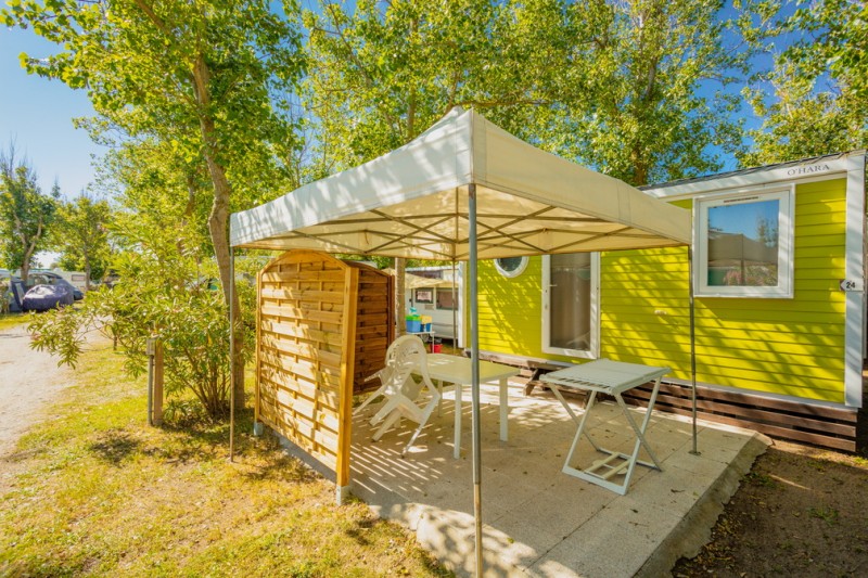 Mobilheim Premium Marseillan-Plage (bis zu 4 Personen): Bettwäsche und Handtücher werden gestellt, Klimaanlage, 2 Schlafzimmer, Doppelverglasung für mehr Ruhe, ausgestattete Küche (Kühlschrank, Mikrowelle, Gasherd, Geschirr), Badezimmer mit Dusche und WC, überdachte Terrasse mit Gartenmöbeln, französische und ausländische Fernsehsender.